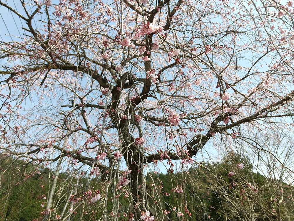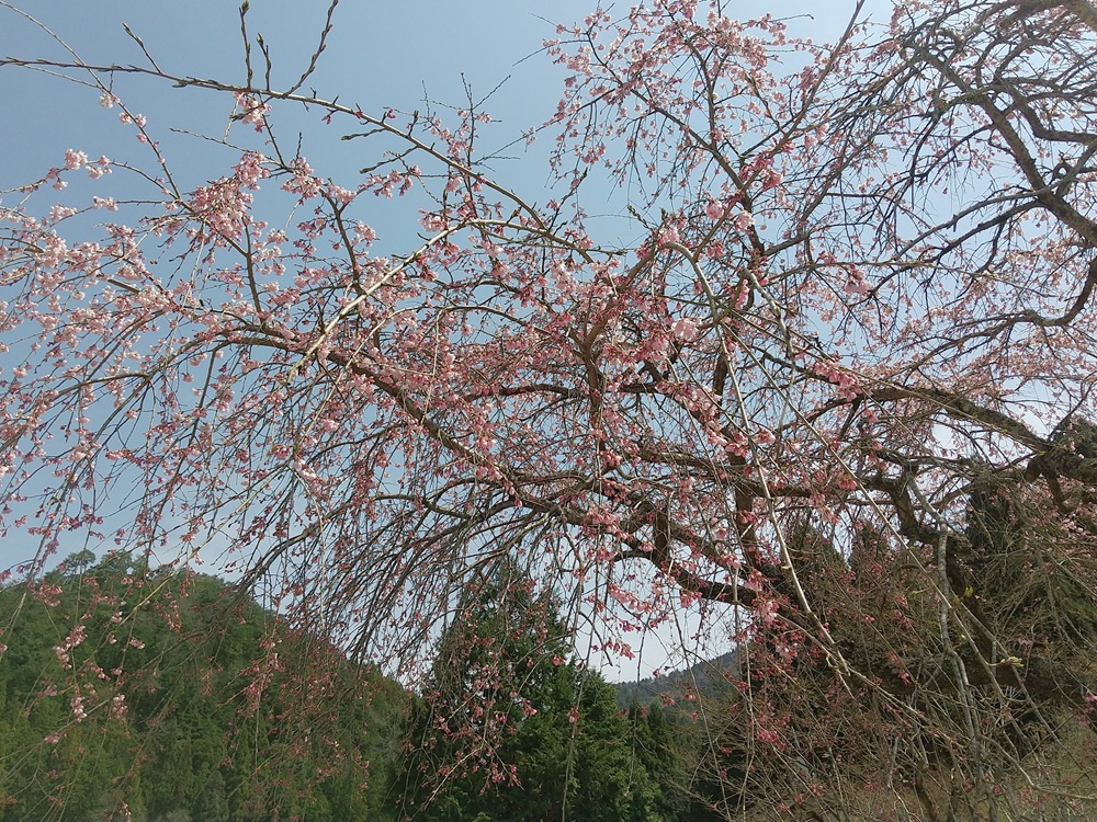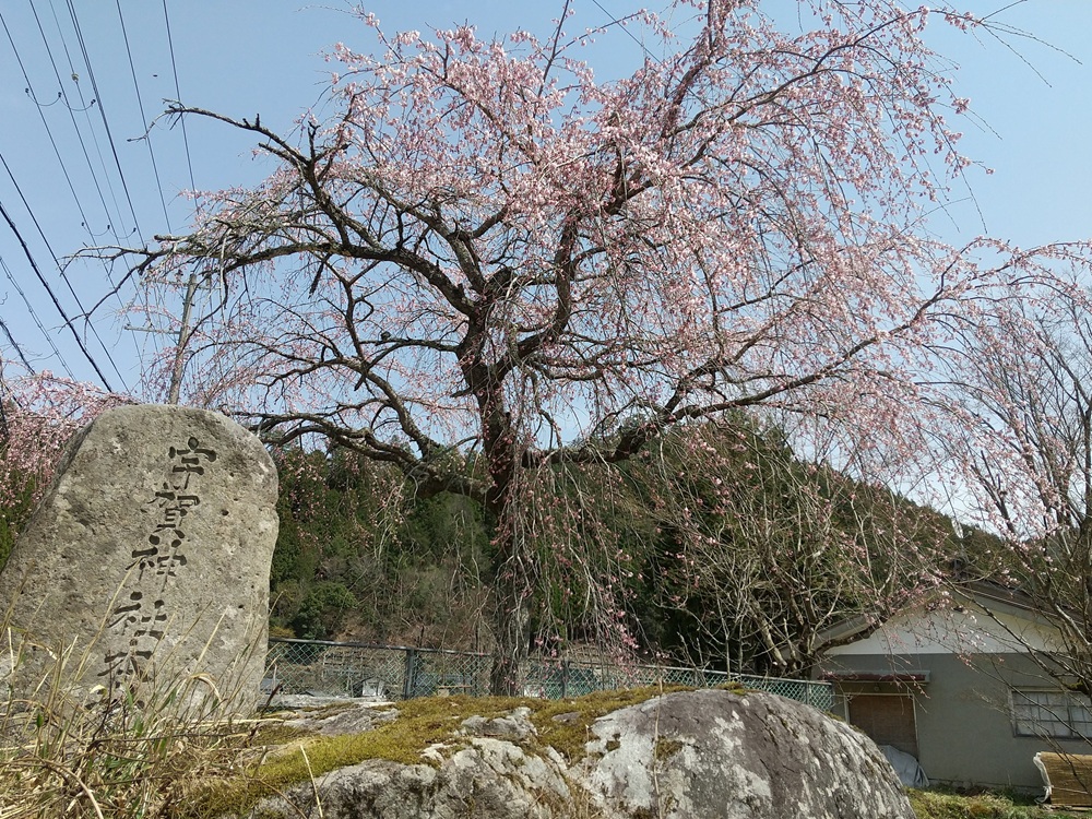 宮地区の宇賀神社跡の池の端に生えるシダレザクラ。