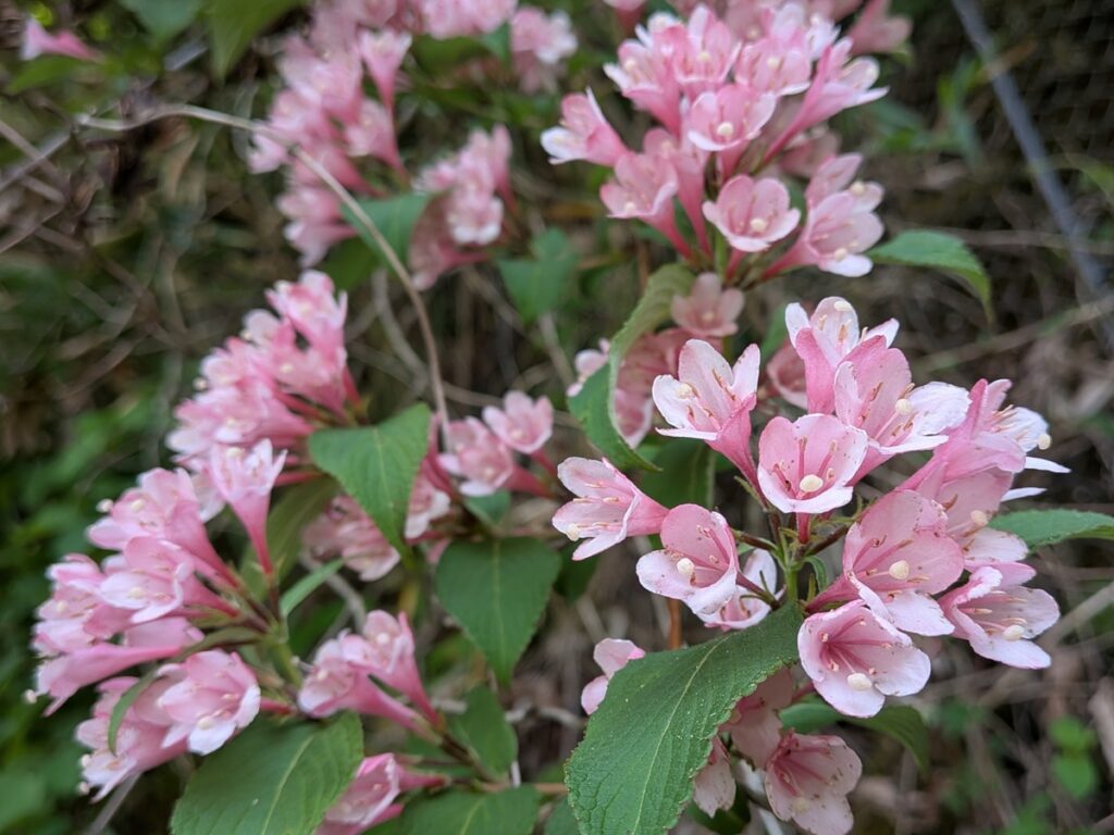 ピンクのタニウツギと白いヒメウツギ、ことしはほぼ同じタイミングで咲き誇っています。
